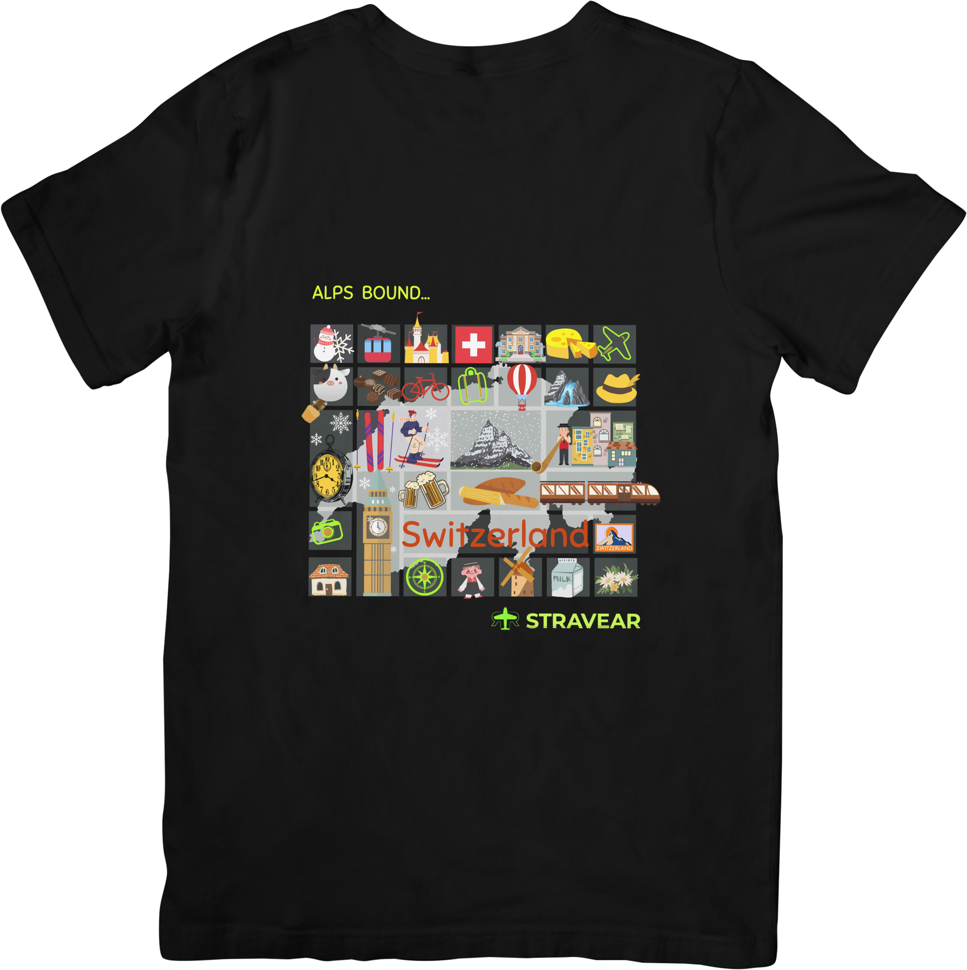 This T-shirt design beautifully showcases a vast range of traditional elements from Switzerland, each captured within smaller rectangles that form part of a larger rectangular design. At the center, a grey-colored map of Switzerland serves as the backdrop, enhancing the intricate details of the illustrations. Featured elements include the majestic Alps mountain, iconic trains of the country, and world-renowned Swiss watches. The design also highlights Swiss clothing, delicious cheeses and chocolates, a cheerful snowman, and the Swiss flag. Emblems of rural life such as cows, traditional cowbells, and quaint Swiss houses add a touch of authenticity. Additional elements like windmills, waterfalls, and bicycles illustrate the country’s picturesque landscapes. A palace and cable cars emphasize the historical and modern aspects of Swiss travel, while beers, breads, and hot-air balloons add to the cultural charm. The design is further enriched with images of a Swiss hat, skiing equipment (ski boots, ski poles), and snowflakes, reflecting Switzerland’s winter sports heritage. Symbols of Swiss financial prowess such as Swiss banks, the traditional musical instrument Alphorn, and the Edelweiss flower complete the comprehensive depiction of Swiss culture. This T-shirt is a perfect tribute to the beauty and traditions of Switzerland, making it an ideal choice for anyone who admires this enchanting country.