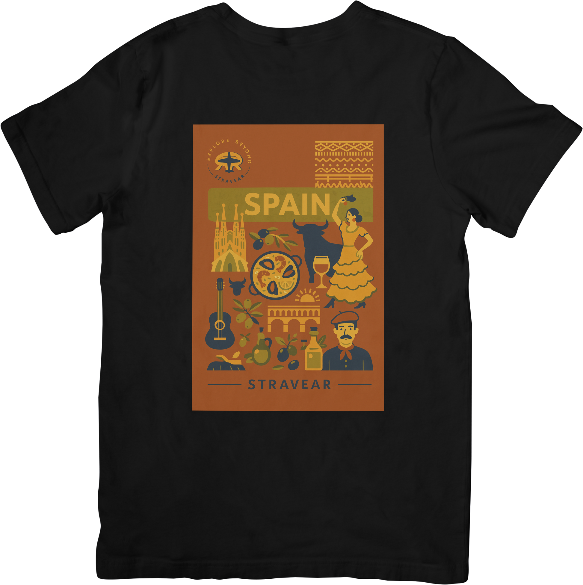 This Spain-themed T-shirt design by STRAVEAR bursts with the energy, flavor, and spirit of Spanish culture. The centerpiece boldly reads “SPAIN,” surrounded by iconic symbols that celebrate the country’s rich heritage. The majestic Sagrada Família represents Spain’s architectural marvels, while a flamenco dancer and a bull pay tribute to traditional dance and bullfighting.